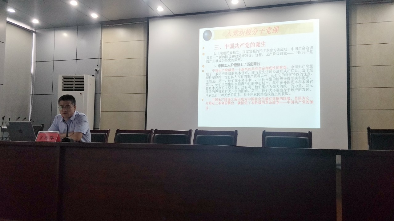 动员结束后,宋西路为本期入党积极分子培训班学员讲授第一节课——中国共产党的诞生与发展。宋西路以中国共产党的成立是历史的必然为主题,展开叙述中国共产党的诞生并带领中国人民取得民族独立、人民解放的伟大奋斗历程;接着又讲述了中国共产党在改革开放前后带领全国人民不断取得社会主义建设新成就的多项重大举措;随后宋西路又以中国共产党在新世纪带领全国人民继续前进为主题讲述了近年来党的各项改革、措施及成就。最后,宋西路为大家深刻阐述了习近平新时代中国特色社会主义思想及党的十九大精神的内涵,勉励大家要不负党和国家的厚望,为实现中国梦而努力奋斗!