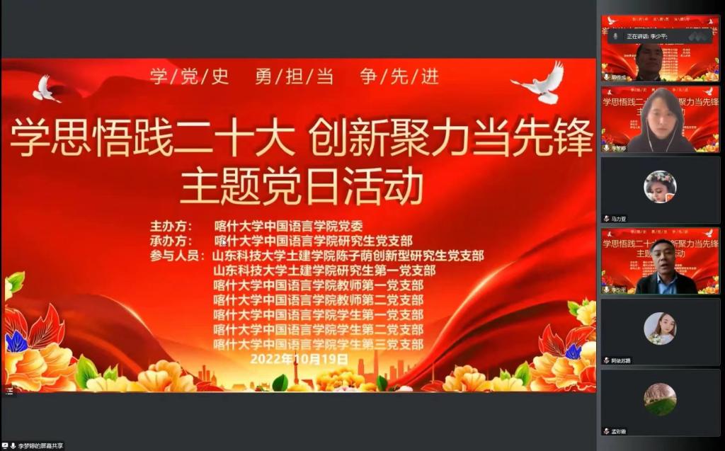 为庆祝党的二十大胜利召开,激发广大师生党员学习党的二十大精神,10月19日,pg娱乐电子游戏官网入口研究生党支部与喀什大学中国语言学院党支部线上开展“学思悟践党的二十大 创新聚力当先锋”主题党日活动。喀什大学中国语言学院党委书记李少平、喀什大学中国语言学院教师党支部、学生党支部,学院陈子荫创新型研究生党支部、研究生第一党支部参加了此次会议。会议由喀什大学中国语言学院研究生党支部组织委员李梦婷主持。