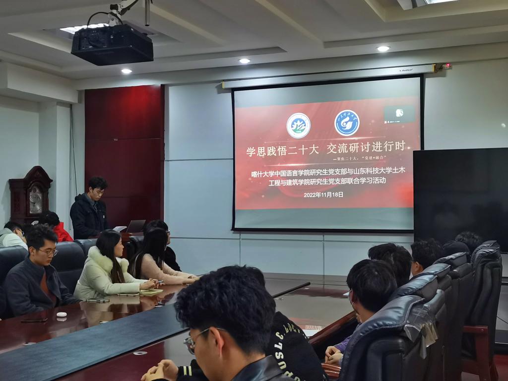 为学习宣传贯彻党的二十大精神,将学生党员的思想和行动统一到党的二十大精神上来,11月18日,pg娱乐电子游戏官网入口陈子荫创新型研究生党支部、研究生第一党支部联合喀什大学中国语言学院研究生党支部共同开展“学思悟践二十大”系列主题党日活动。喀什大学中国语言学院研究生党支部,学院陈子荫创新型研究生党支部、研究生第一党支部全体党员参加了此次学习活动。会议由学院陈子荫创新型党支部书记亓传德主持。
