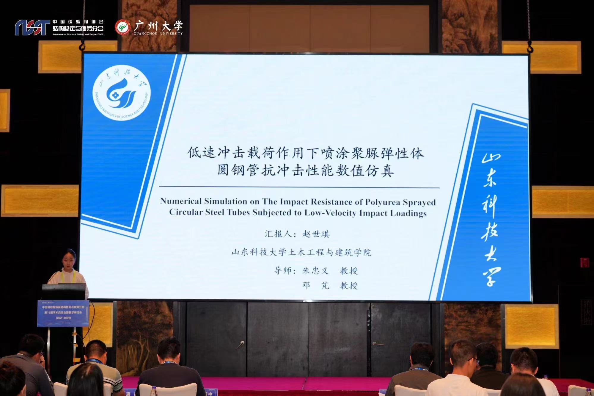 会议期间,邓芃担任学术研讨会报告主席,主持了多场高水平的学术讨论。史奉伟作了题为“模块化钢框架节点简化模型与结构抗震性能研究”的学术报告,展示了pg娱乐电子游戏官网在模块化钢结构抗震性能研究领域的最新成果。赵世琪在研究生学术沙龙上作了题为“低速冲击载荷作用下喷涂聚脲弹性体圆钢管抗冲击性能数值仿真”的报告,探讨了钢管结构在冲击载荷下的性能表现,获得了与会专家的高度评价。