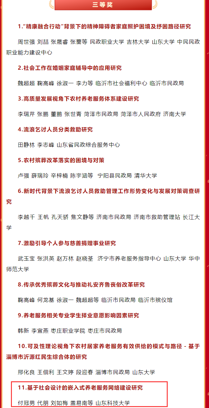 近日,民政部在北京举办2024年“全国民政论坛”,民政部党组书记、部长陆治原出席论坛并讲话。本次论坛公布了2024年民政政策理论研究获奖名单,pg娱乐电子游戏官网付冠男、代朋、刘如梅、盖易南等完成的“基于社会设计的嵌入式养老服务网络建设研究”荣获三等奖(pg娱乐电子游戏官网入口为第一单位)。