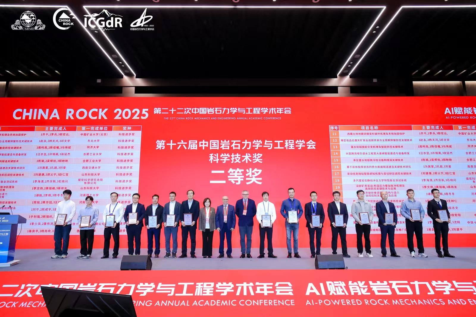 10月18日,CHINAROCK2025第二十二次中国岩石力学与工程学术年会在河北雄安隆重召开。会议期间,中国岩石力学与工程学会举行了2025年科学技术奖颁奖仪式,我校作为第一完成单位,pg娱乐电子游戏官网李文帅教师主持完成的“深部矿井采动-构造应力叠加致冲机理及高效防控关键技术与应用”项目获科技进步二等奖、黄娜老师作为主要完成人完成的“岩质隧道地震动灾变理论及吸能减震设计方法”项目获自然科学二等奖。