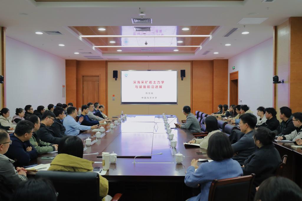 陈旭光教授围绕深海采矿岩土力学与装备前沿进展主题,作了一场精彩学术报告。他指出,在国家“双碳”战略背景下,深海采矿为未来可持续发展提供了重要能源支撑,对推动绿色能源转型具有重大的战略意义。同时,陈旭光教授针对履-土动态相互作用及平稳行走、射流-土耦合作用及高效射流采集、深海采矿低扰动-抑羽流方法及装备等关键问题的研究成果进行了详细的介绍。会上,针对海洋工程结构热点问题,陈旭光教授和团队青年教师、研究生进行了深入讨论,并给与了详细指导,对pg娱乐电子游戏官网海洋土木工程学科发展提出了建设性意见。此次报告交流会不仅为团队教师在海洋资源开发领域的研究提供了宝贵的建议和思路,也为师生打开了一扇了解前沿学术动态的窗口。