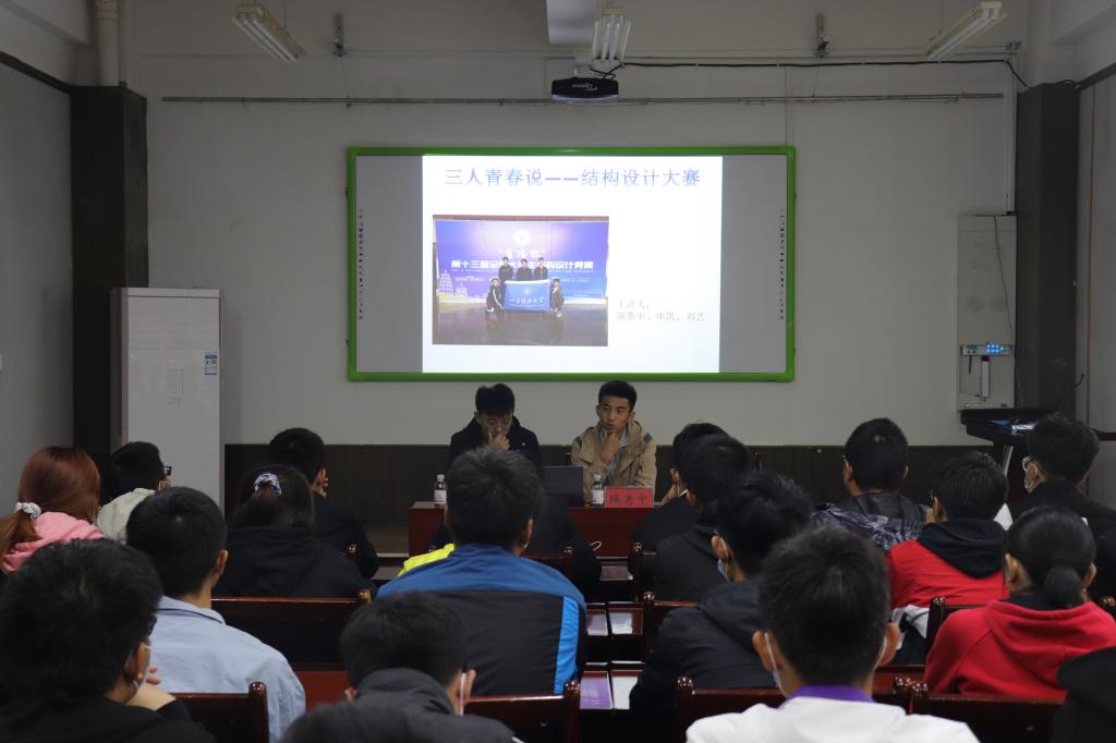 10月29日下午,pg娱乐电子游戏官网入口在J15-201顺利举办了“三人青春说”之结构设计大赛经验分享论坛活动。本次活动由绳惠中、刘艺、申凯三位优秀学生担任主讲人。