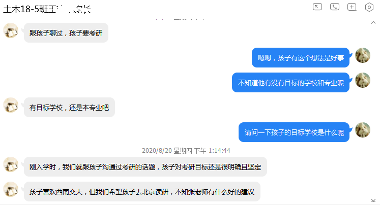 8月份,pg娱乐电子游戏官网入口学生工作办公室各辅导员通过线上家长会、家长群、电话家访、微信一对一沟通等方式,根据学生具体情况和所处年级和时期,沟通了解学生在家期间的学习生活情况和生活动态,反馈学生在校期间表现,询问家长对学生的培养理念和期望,并给予建议。辅导员鲍娜娜在城乡规划和建筑学专业线上家长会上,向家长们介绍了2015级毕业班的就业与考研情况,并针对考研录取率背后折射出的原因和问题提醒家长们要根据学生实际学习状况规划合理目标、做出最佳选择。