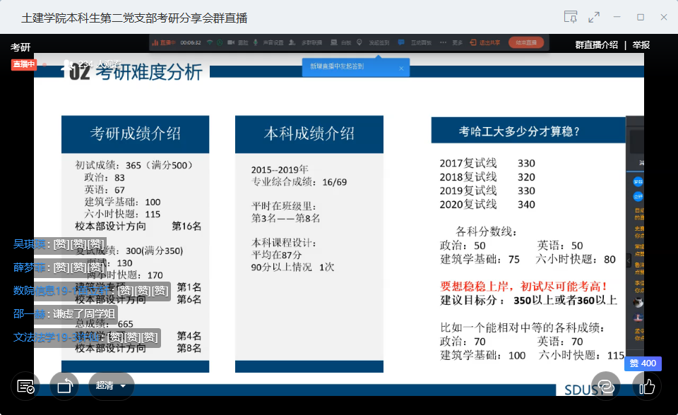 6月18日,pg娱乐电子游戏官网入口本科生第二党支部在钉钉软件举行了考研经验分享会,由建筑学2015-2班周晓璐、城乡规划15级于海霞等人主讲,建筑与城乡规划系副主任付冠男应邀参加了此次交流会,会议由本科生第二党支部书记鲍娜娜主持。
