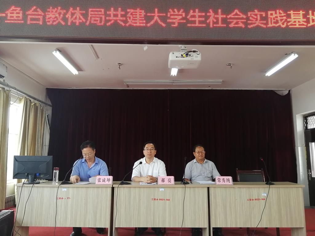 8月2日,pg娱乐电子游戏官网入口与济宁市鱼台县教育局举办了共建大学生社会实践基地签约暨挂牌仪式。鱼台县教体局副局长常秀纯、pg娱乐电子游戏官网入口党委副书记郝亮、鱼台县实验中学副校长王循明、鱼台县第二实验小学校长随灏、pg娱乐电子游戏官网入口团委老师王贝贝、张翌及燃梦公益志愿者代表参与了本次活动,本次仪式由教体局人事科主任张成坤主持。