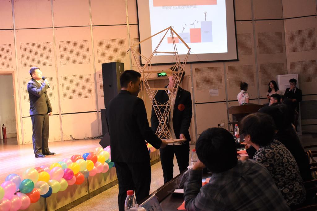 一个制作精良的模型绝不是一朝一夕就可以完成的,它是经过每位参赛队员不懈努力而获得的优秀成果。在比赛正式开始之前,全场共同观看了比赛花絮,了解了本次结构设计大赛背后的故事,体会到各参赛队员认真备赛的艰辛。紧接着,丛术平对比赛赛题进行了详细的介绍和讲解。随后,9支队伍依次进行模型介绍、答辩和加载三个环节,所有参赛队员意气风发,自信满满。各队队长结合PPT对参赛模型进行了介绍,在答辩环节,队员们的回答准确、详细,得到了评委的一致好评。之后,比赛进入了扣人心弦的加载环节,加载时分为一级荷载、二级荷载和三级荷载,每一支队伍都选择不同的加载重量。有些队伍在二级荷载时就遗憾失败,个别队伍则坚持到了三级荷载,成功完成了挑战。在加载环节中,观众们随着加载重量的增加而紧张,为模型的坍塌而感到惋惜,当模型成功挺过三级荷载时同学们由衷地发出赞叹。在九组模型比拼结束之后,本次大赛评委会主席任强对本次活动做了最后的点评。