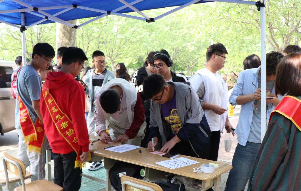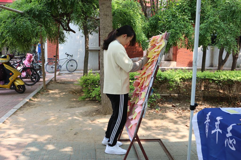 清晨,青协志愿者们便早早地到指定地点集合完毕,并按照分工收拾好场地,做好准备工作。同学们在志愿者的引导下,有序参加本次活动。首先,志愿者们给同学们发放明信片或便利贴,同学们在上面写下自己想对母亲说的话。虽然没有华丽的藻饰,但同学们淳朴的语言无不饱含着深情。随后,在志愿者们的帮助下,同学们面对镜头,通过视频将自己最真诚的祝福传递给母亲。最后,同学们在条幅上签上自己的名字,并将便利贴贴在活动展板上。