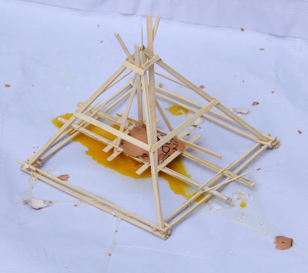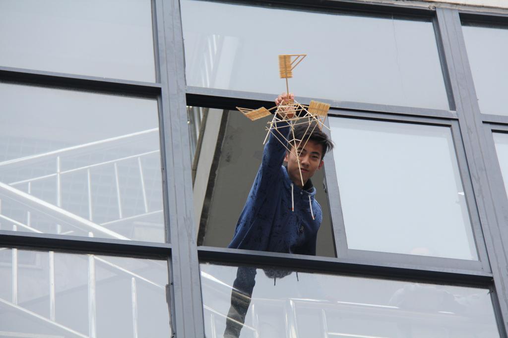 比赛最大的吸引力来自新颖有趣的赛题——高空护蛋。该赛题要求各参赛队根据主办方提供的竹条、牙签、胶水、鸡蛋等材料制作一个护蛋结构(要求鸡蛋可视度在40%以上,结构类型不限),以鸡蛋从15米高空落下后的完好程度和结构的稳定性为评分标准。比赛主要分为三个阶段:4月24日18:00-22:00,pg娱乐电子游戏官网入口科技学习部同学为270个参赛队发放了比赛材料;25-26日,各参赛队自由制作模型,他们不分昼夜地设计和制作模型、进行模拟实验,不断进行修改和完善;27日为模型检测。模型检测当天,参赛团队签到后,工作人员对结构进行称重(要求模型不得超过220g),随后评委从外观的美感程度、结构的稳定程度进行打分,打分完毕,选手自行在15米左右的高空将模型扔下,最后评委老师再次根据鸡蛋和模型破损程度打分。
