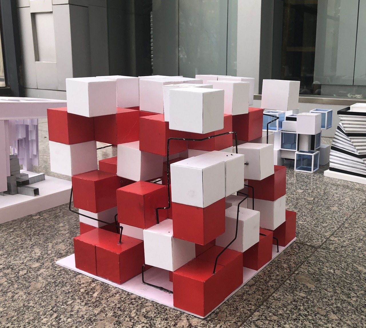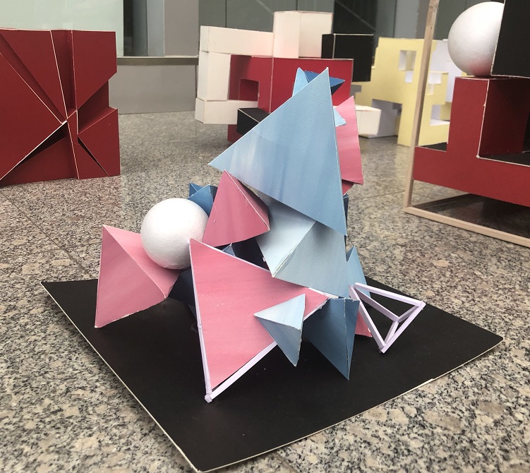 本次构成模型展览的作品包括“切割”与“堆积”两个板块。“切割”要求将具有空间限制性的体块通过分割、消减等手段,制作成富有变化的简单空间几何体;而“堆积”则要求反复利用简单几何体,通过堆叠、重复等形成具有一定趋势性的空间几何体。同学们严格按照要求,使用了各具特色的设计理念与形体概念,利用Sketch up与V-ray等软件进行设计,使用不同材料制作完成。