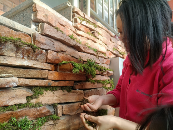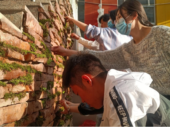 苔藓景观墙自四月初创立概念,前后历经概念设计、线稿绘制、景观规划、原料收集以及苔藓铺设,利用蓄水麻绳的毛细原理灌溉苔藓,在pg娱乐电子游戏官网入口楼西大厅绘制了一幅“绿色屏障”。后期养护中,除储水缸蓄水外在大厅处放置喷壶,通过倡导途经师生进行互助浇灌,在学院内形成互帮互助的优良氛围。