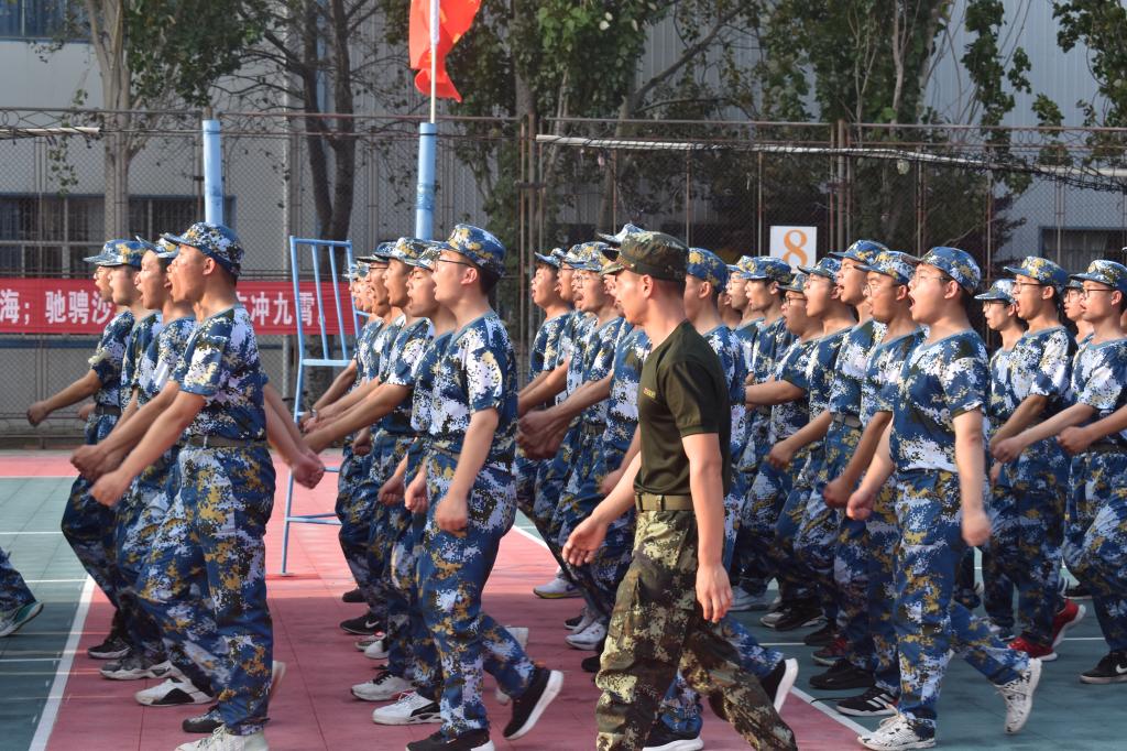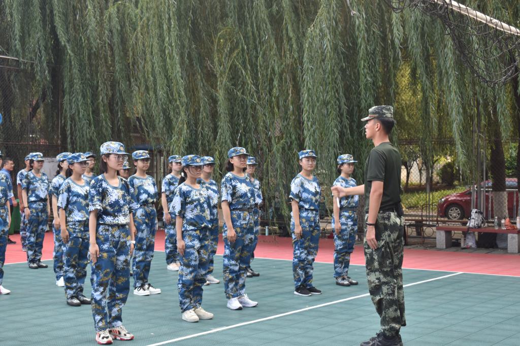 阳光透过白云没有遮蔽的照射在同学们的皮肤上火辣辣的,额头上的汗珠一滴滴划过脸颊,在同学们晒得红红的脸上留下一道道痕迹。立正、齐步、跑步、脱帽……一遍又一遍,教官们不厌其烦的喊着,在队列中来回穿梭指导,沙哑却底气十足的声音一遍遍的回响在排球场上。军训是辛苦的,也是幸福的,来自五湖四海的同学们相聚在一起,慢慢从陌生到熟悉,既磨练了意志,也增进了感情。