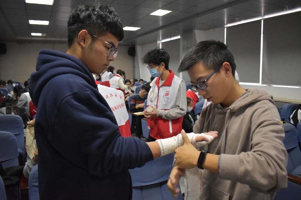 此次培训主要包括三部分内容:包扎止血、常见意外的应对措施、心肺复苏。活动伊始,宣讲团成员对包扎止血进行了具体讲解和现场演示,练习环节中对同学们进行了“一对一”地指导,耐心地纠正了同学们的错误,让每一位同学都能掌握急救技能。随后,在讲解常见意外的应对措施环节,宣讲团通过PPT展示和视频演示的形式为同学们普及了气道梗阻和烧烫伤等日常意外的科学应对措施,使意外发生时同学们的急救更加快速有效。活动最后,在心肺复苏的展示环节,同学们在讲解员的指导下成功演示了心肺复苏。通过讲解员仔细的讲解和志愿者们的帮助下,同学们积极参与练习,收获颇丰。