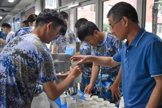 在各班级负责人的组织下,学院2023级新生们有序排队前往宿舍楼下领取姜茶,学院党委书记宋西路、党委副书记高静、学生工作办公室辅导员们将温热的姜茶递给同学们。宋西路勉励新生们要发扬吃苦耐劳精神,为自己未来四年的学习生涯系好第一粒扣子,把军训中的优秀品质延续到日后的学习和生活中去。有一位同学接过姜茶时说:“感谢学院领导和老师们的暖心关怀,能够来到山科、来到pg娱乐电子游戏官网入口真是既幸运又幸福。”