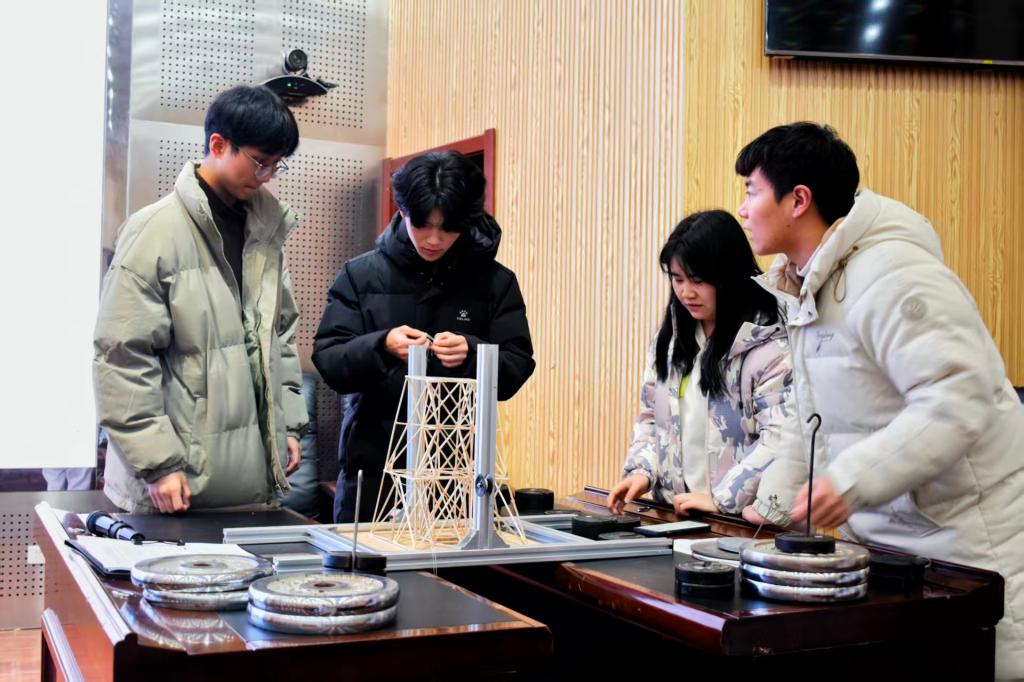比赛共吸引pg娱乐电子游戏官网入口8支队伍参加。作品涵盖经典桁架创新与智能建造构想等方向。赛程包括方案汇报、答辩展示与加载测试三个环节。在加载测试中,各模型接受专业承重检测,通过荷载数据与变形情况直观验证结构性能。最终,“逐梦匠星队”凭借优化的空间桁架与交叉斜撑结构荣获一等奖,“魔力无限队”获二等奖,“痴心绝队”“建模实践小组”“星际航队”获三等奖。