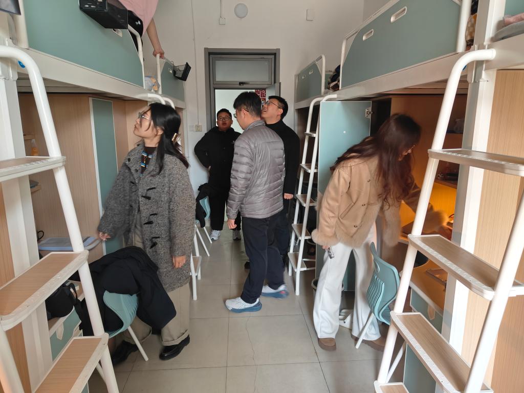 在学生宿舍,辅导员老师们重点查看了宿舍家具、门锁更换及使用情况,逐一检查床铺、衣柜、书桌等家具的稳固性,细致查看门锁更换后的安全性,对排查中发现的轻微隐患现场督促整改,确保学生居住安全。同时,高静与返校学生亲切座谈交流,耐心询问学生假期生活、返校途中情况及新学期适应状态,细致了解学生对宿舍装修、住宿条件的意见建议,认真倾听学生在学业发展、生活保障等方面的困难和诉求。针对学生提出的合理建议,辅导员老师们现场记录、明确整改方向;对于学生遇到的实际困难,逐一耐心回应、积极协调解决,用暖心话语和务实行动,让学生感受到学院的关怀与温暖。